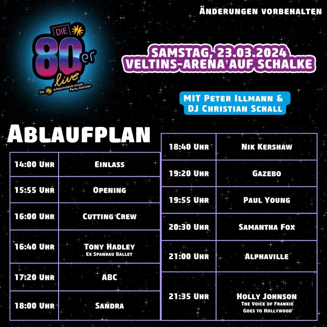 Me olimme sisällä hallissa hyvissä ajoin ja pääsimme suht lähelle lavaa. Emme tosin sinne aivan lavaneduskarsinaan, jossa olimme viime vuonna. En vieläkään ole varma, olisivatko lippumme oikeuttaneet pääsyn sinne, mutta tyydyimme tähän toiseen osastoon. 158-senttinen vaimoni tosin ei nähnyt yhtään mitään, joten seisomakatsomoa en voi suositella alle 189-senttisille. Ensimmäisenä esiintyneen Cutting Crew’n aloitettua huomasin kuitenkin, että 44000:lle katsojalle 45000:sta on yhdentekevää kuka lavalla heiluu. Saksalaiset olivat tulleet paikalle ryyppäämään ja bailaamaan. Paras meno yleisön joukossa tuntui olevan artistien välissä levyjä pyörittäneen DJ Christian Schallin pistäessä parastaan. Tilaisuuden juontajana toimi edellisvuotiseen tapaan 1980-luvun Peter’s Pop Show’sta tuttu Peter Illmann.