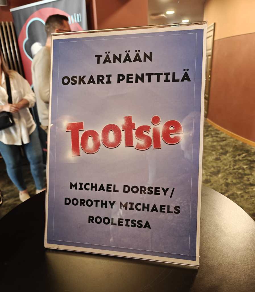Suurin syy miksi päätin matkustaa Poriin asti teatteriin oli ”Tootsie” -musikaalin päätähti Joonas Nordman, joka on ykkössuosikkini tämän hetken suomalaisista näyttelijöistä ja koomikoista. En liene missannut yhtäkään sketsisarjaa, visailua tai talk show’ta jossa on ollut mahdollista nähdä Joonas. Valitettavasti en sitten kuitenkaan häntä Porissa nähnyt. Pettymys oli VALTAVA, kun vasta saliin astuessani näin kyltin jossa kerrottiin ympäripyöreästi ”Tänään Oskari Penttilä Michael Dorsey/Dorothy Michaels rooleissa”. Olin ehkä niin puulla päähän lyöty, että jouduin kysymään vaimoltani ”Mitä tuo kyltti tarkoittaa?” No sehän tarkoitti sitä, että Joonas Nordman ei esiintynyt tuona iltana.