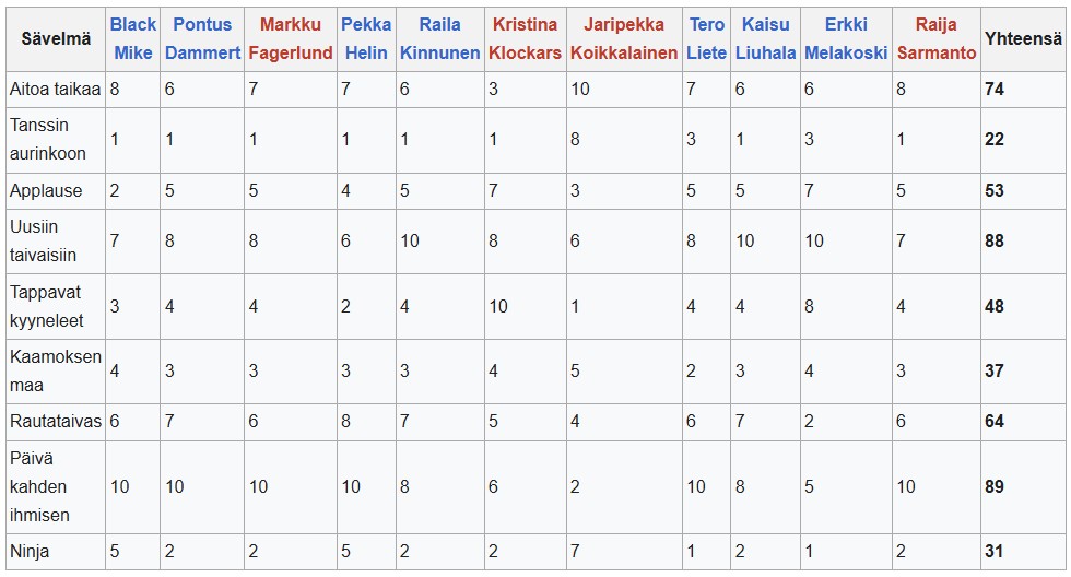 Raatilaiset laittoivat kilpailusävelmät mieleiseensä paremmuusjärjestykseen ja antoivat parhaaksi katsomalleen kappaleelle kymmenen pistettä. Toiseksi paras sai kahdeksan pistettä ja siitä eteen päin pisteitä annettiin kaikille järjestyksessä aina heikoimpana pitämänsä laulun yhteen pisteeseen asti. Vielä ennen äänestystä korostettiin, että nyt haetaan kansainvälistä menestystä. Lopullisissa tuloksissa Kari Kuivalainen vei voiton vain yhden pisteen marginaalilla Kirkaan nähden. Kirka ja Kim Lönnholm pitivät hallussaan sijoja 2-4 yhdessä ja erikseen.