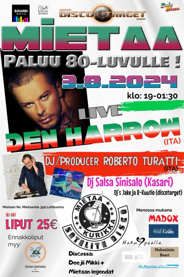 Den Harrow (oik. Stefano Zandri, s. 1962) saapuu Suomeen. 1980-luvulla lukuisia italodiscohittejä julkaissut ja Keski-Euroopan listoilla menestynyt artisti esiintyy 3.8.2024 Kurikassa "Paluu 80-luvulle!" -tapahtumassa. Bileet järjestetään legendaarisessa Mietaan Nuorisoseuran talossa. Den Harrowin lisäksi kekkereillä esiintyy mm. italialainen DJ/Tuottaja Roberto Turatti, joka 1980-luvulla vastasi myös Harrowin hittien tuotannosta. Turatti on tehnyt italodiscohittejä myös mm. Eddy Huntingtonille,... Continue Reading →